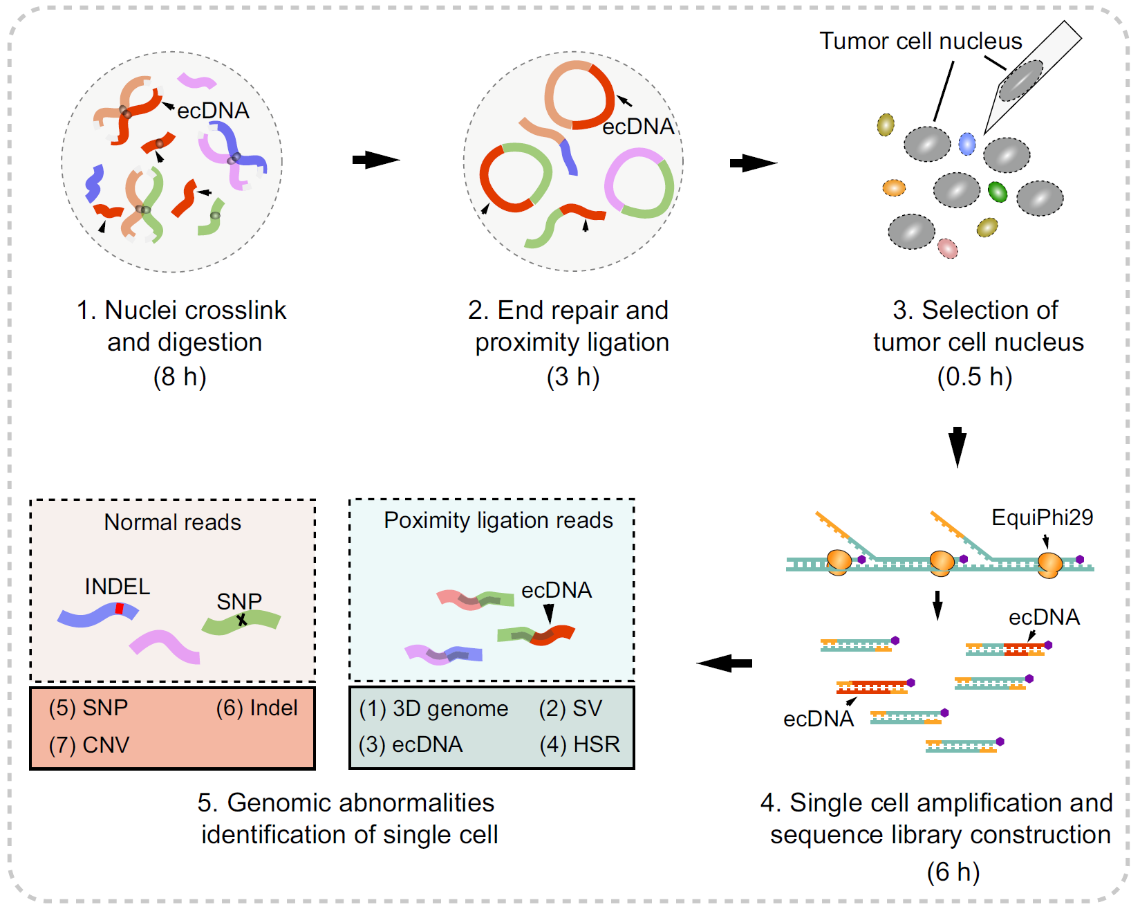 近日,中國科學(xué)院廣州生物醫(yī)藥與健康研究院譜系基因組多維技術(shù)研究組林達(dá)研究員在Nature Communications期刊發(fā)表研究成果,報(bào)道了新開發(fā)的單細(xì)胞多組學(xué)技術(shù)-Uniform Chromosome Conformation Capture(Uni-C)。該方法可在一個(gè)細(xì)胞中同時(shí)解析基因組大尺度結(jié)構(gòu)變異(如SV、CNV、ecDNA)、小尺度突變(SNP/INDEL)以及染色質(zhì)三維構(gòu)象,實(shí)現(xiàn)高分辨率、多維度的聯(lián)合分析(圖1)。